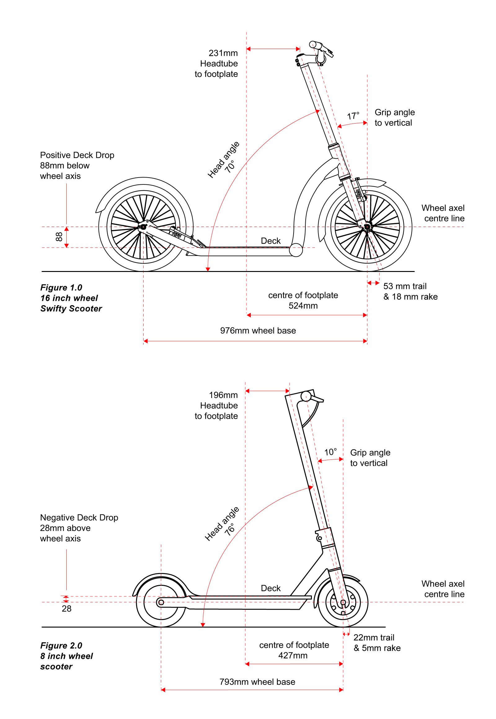 With this in mind we decided to measure the geometry of the most popular 8 inch wheeled e-scooter and compared against our 16 inch wheeled scooters.