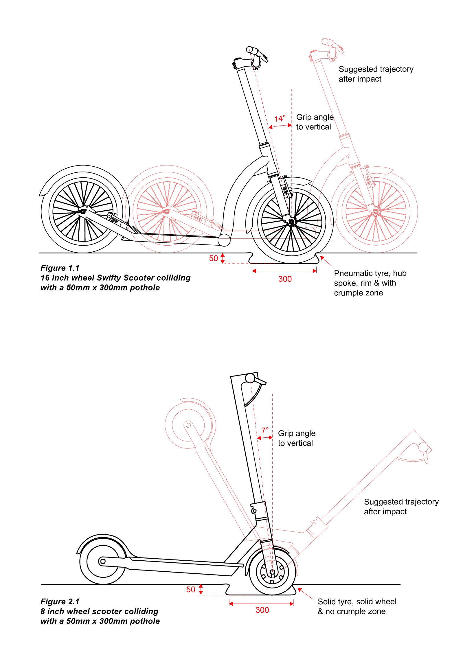 By comparison, when the 16” scooter shown in fig 1.1 strikes the pothole edge it is probable that the larger pneumatic tyre would deform under impact, cushioning the blow, and promoting the wheel to roll up and over the edge of the pothole. The lower centre of gravity, larger headtube angle, greater trail and larger bicycle spec wheel and pneumatic tyres are all factors that would help support this result and conclude that this would be a low-risk event to the rider.