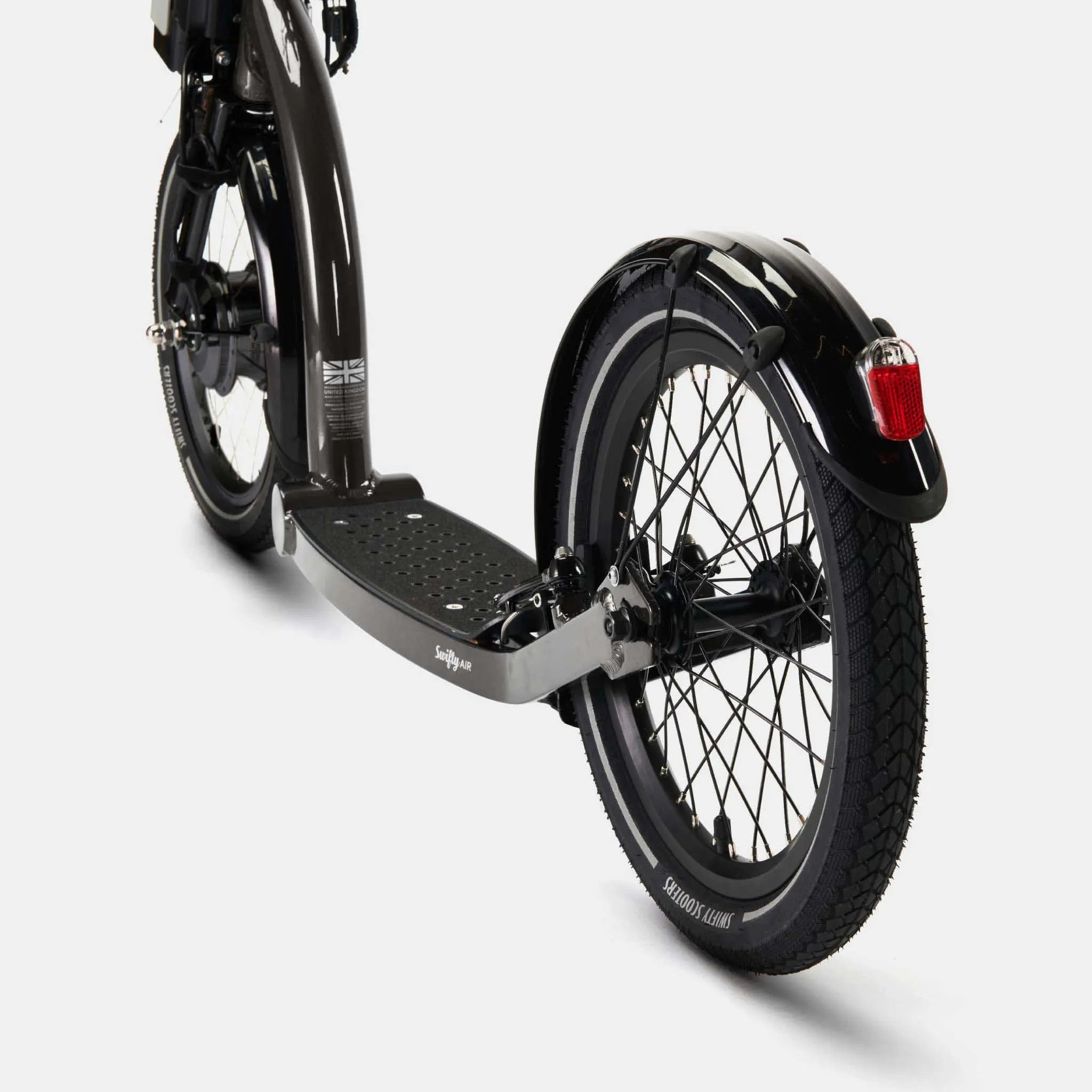 With safety in mind, the SwiftyAIR-e comes with front and rear lights; front, rear and side reflectors (tyre wall); and a stylish brass dome Swifty bell! We strongly recommend riders wear a helmet, and high-vis and reflective clothing at night.