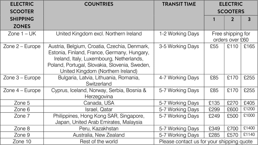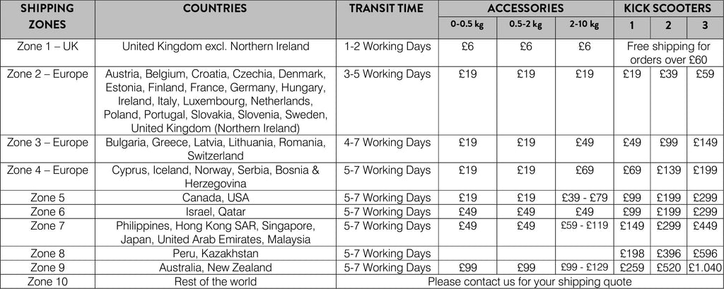 For Kick-Scooters and Large Accessories: UK- Fedex, International - DHL/Fedex